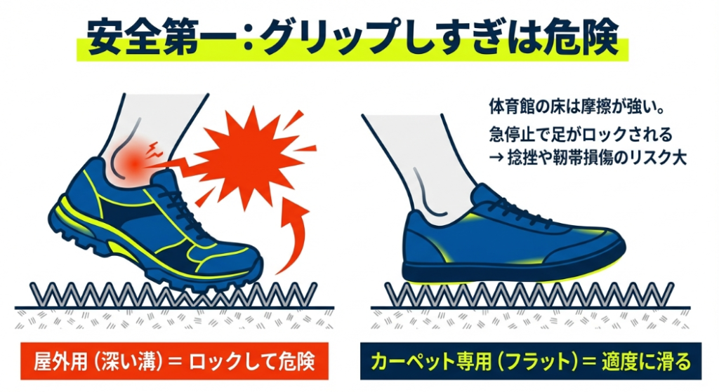 ただし、この兼用アプローチにはいくつか知っておくべきリスクや注意点も存在します。まず一つ目は、カーペット専用のツルツルしたシューズに比べると、どうしても摩擦係数が少し高くなるため、スライディングなどの高度なフットワークを行う際には、足の引っかかりに十分注意を払う必要があるということです。