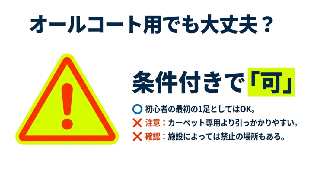 - カーペットコート専用とオールコート用の違いや兼用のリスク