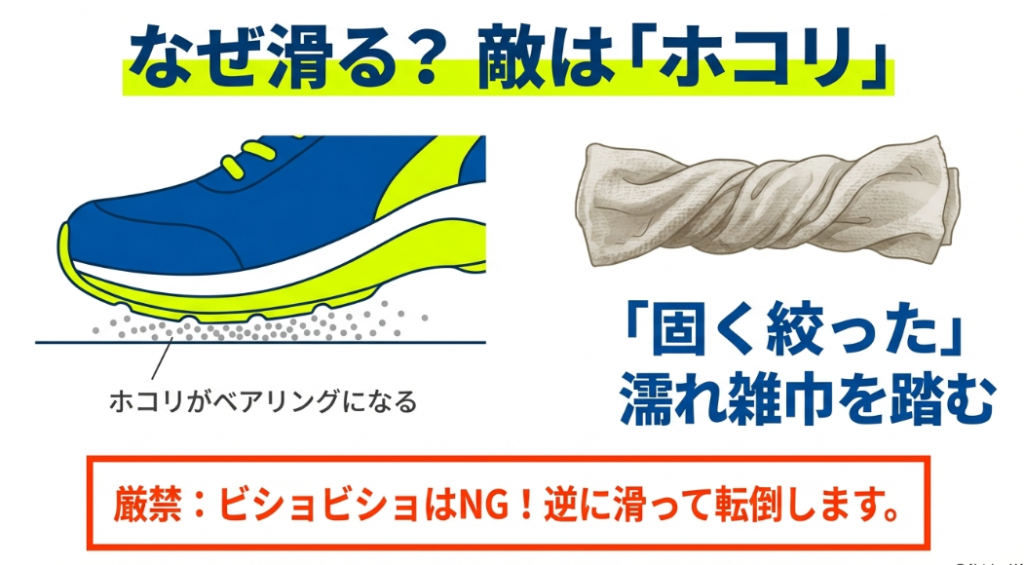 ただし、ここで絶対に注意してほしいのが「水分の量」です。雑巾がビショビショの状態で踏んでしまうと、靴底と床の間に分厚い水の層ができてしまい、自動車のタイヤで起こる「ハイドロプレーニング現象」と同じ状態になります。水が潤滑油のようになって摩擦力が完全にゼロになり、氷の上を歩くように滑って転倒する危険性が跳ね上がります。対策を行う際は、必ず親の仇のように「これでもか!」と固く絞った雑巾を使うようにしてくださいね。