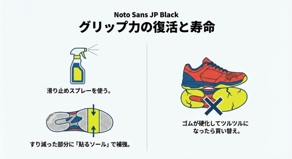 濡れ雑巾を使った水分コントロールの対策は、あくまでほこりが原因の一時的な滑りに対する応急処置に過ぎません。長期間、何ヶ月もハードに使い続けていると、アウトソールのゴム素材自体が空気に触れて酸化し、カチカチに硬化する「経年劣化」を起こします。また、表面の細かいテクスチャが完全にすり減ってツルツルになってしまった場合、それは残念ながらシューズの寿命を迎えたサインです。でも、アッパー(甲の部分)のフィット感は最高だし、見た目もまだ綺麗だから、なんとかもう少しだけ延命させたい……という場面もあるかなと思います。そんな時に使える、ちょっとした裏技的な補修方法をご紹介しますね。
