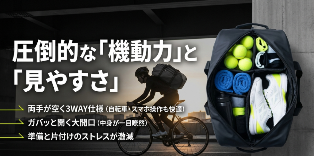 テニスプレイヤーの皆さんは、普段どのような手段でコートまで移動されていますか?週末に車で仲間と乗り合わせる方もいれば、平日の仕事終わりに電車や地下鉄を乗り継いでインドアスクールに通う方、あるいは自宅から自転車やロードバイクで河川敷のコートへ向かう方など、本当に多種多様かなと思います。現代はライフスタイルの中にスポーツを柔軟に取り入れる層が増加しており(出典:スポーツ庁『スポーツの実施状況等に関する世論調査』)、それに伴ってテニスギアの運搬方法にも高い柔軟性が求められるようになっています。