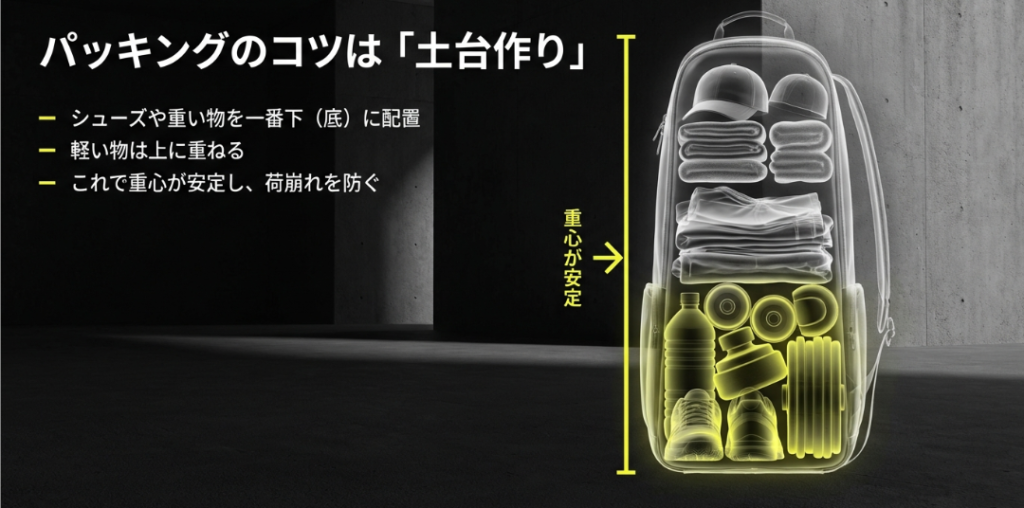 しかし、安心してください。この問題を解決するには、少しだけパッキングに工夫を加えるだけで劇的に改善します。最大のコツは、「最初から縦に背負うことを想定して荷物を詰める」ことです。具体的には、背負った時に一番下になる部分(横置き時の側面)に、シューズや重いステンレスボトル、ボールの缶など、重量があって形が崩れないものを配置し、強固な土台を作ります。その上に、タオルや着替えなどの軽くて柔らかいものを積み重ねていくことで、重心を適切な位置にコントロールし、荷崩れを防ぐことができます。