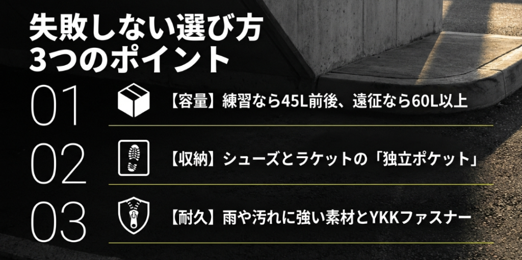多種多様なボストンバッグが各メーカーから発売されている中で、自分のプレースタイルや荷物の量に完全にフィットする「最高の相棒」を見つけるためには、明確な基準を持って選ぶことが大切です。デザインの良さだけで衝動買いしてしまうと、後で「シューズが入らない…」「重すぎて肩が痛い…」と後悔することになりかねません。自分にぴったりのバッグを選ぶためには、容量、収納機能、そして耐久性の3つ(+α)を必ずチェックしてみてください。以下の表に、テニスプレイヤー視点での簡単な目安をまとめてみました。