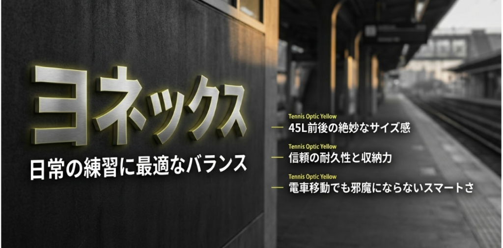 国内トップシェアを誇るヨネックス(YONEX)は、ラケットだけでなくバッグのカテゴリにおいても非常に優秀な製品を多数展開しています。中でも私が個人的に強くおすすめしたいのが、日常の練習や大学のサークル活動、週末の市民大会などにちょうどいい45リットル前後の絶妙なサイズ感を持ったダッフルバッグ(BAG2324などのシリーズ)です。60リットルを超えるような巨大な遠征用バッグだと、満員電車に乗る際に周囲の迷惑にならないか気を使ってしまいますが、45リットルクラスであれば、背負っていてもスマートに身動きが取れるのが良いですね。