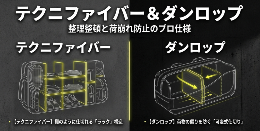 さらに素晴らしいのは、この仕切りが「可変式」である点です。例えば、冬場でかさばるベンチコートを入れたい時や、フォームローラーのような長尺物を収納したい時は、仕切りをパタンと倒して底面にフラットに敷くことで、巨大な一つの空間として使うこともできます。その日の荷物の種類や量に合わせて、自由自在に内部のレイアウトを変更できるのは、プレイヤーの実際の行動様式を深く理解したダンロップならではの、かなり気の利いた工夫ですよね。