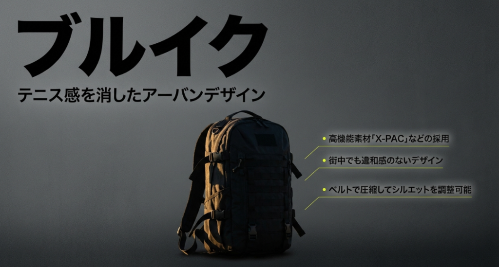 ブルイクのバッグの最大の特徴は、素材選びへの異常なまでのこだわりです。ヨットの帆に使われるような高強度のセイルクロスや、軽量でありながら極めて高い耐久性と防水性を誇る先端素材「X-PAC」を惜しげもなく採用しています。表面に見える特徴的なダイヤ状の模様や、ミリタリーギアやタクティカルバックパックを彷彿とさせる無骨なディテールは、所有する喜びを強く刺激してくれます。また、ベルクロ(マジックテープ)部分にお気に入りのワッペンを貼ってカスタマイズできるなど、遊び心も満載です。