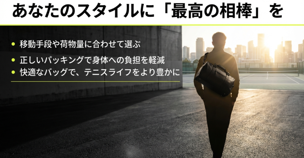 どのバッグを最終的に選ぶかは、あなたが普段どれくらいの荷物を持ち歩くのか、電車なのか自転車なのかといった交通手段の違い、そしてコート外でどんなファッションに合わせたいのかという、あなた自身の「プレースタイルと生活動線」によって正解が変わってきます。身軽さを重視するならヨネックス、システマチックな整理整頓を求めるならテクニファイバー、荷崩れを防ぐギミックに惹かれるならダンロップ、そして圧倒的なアーバンデザインを愛するならブルイク。ぜひご自身のスタイルを自己分析しながら、妥協のない最高の相棒を見つけ出していただきたいなと思います。