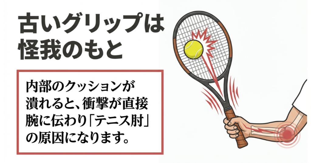 劣化したグリップを使い続けるのは、実はとても危険なんです。内部のスポンジが潰れて衝撃吸収性が失われると、ボールを打ったときの強烈な振動が直接腕に伝わってしまいます。