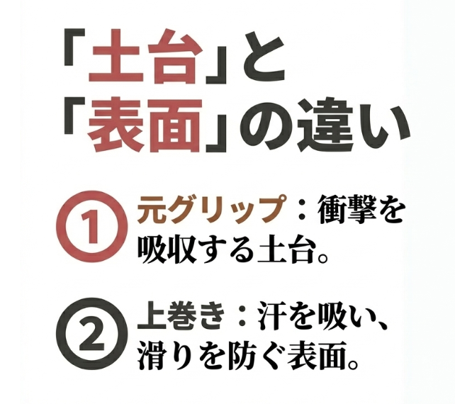 よく混同されがちですが、元グリップと一番上に巻く「オーバーグリップ」は役割が全く違います。