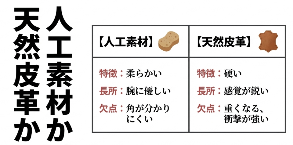 元グリップには、大きく分けてシンセティックレザー(人工素材)天然皮革(レザー)の2種類があります。どちらを選ぶかによって、打球感やラケットの操作性がガラッと変わるんですよ。