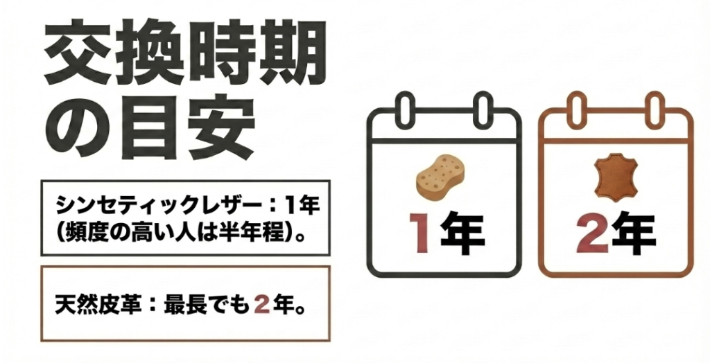 シンセティックレザーの場合、週末にプレイする一般的な頻度の方でも、使用開始から1年が経過した時点が交換の目安になります。フルスイングでボールを強く打つハードヒッターや、頻度の高い学生は半年程でスポンジがへたってしまうこともあります。天然皮革(レザー)の場合はスポンジのへたりはありませんが、汗による乾燥やひび割れが進むため、長くても2年が寿命の限界かなと思います。