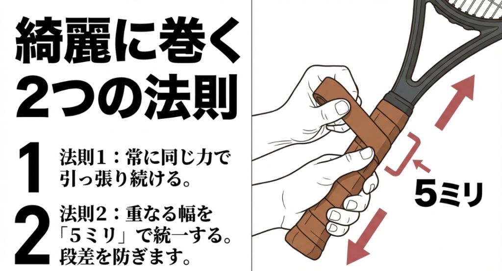 重なる部分の幅がバラバラだと、握ったときに予期せぬ段差ができてしまい、プレイ中の違和感やマメの原因になってしまいます。ラケットをゆっくり回しながら、斜めに一定のペースで巻き上げていってください。
