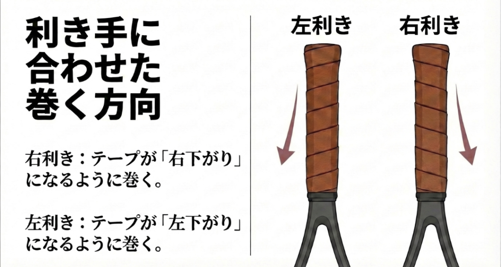 実は、グリップテープを巻く「螺旋の方向」は、利き手によって変えるべきだということをご存知ですか?