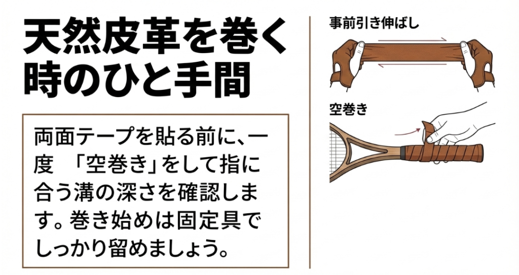レザーグリップ特有の裏面にはあらかじめ粘着テープが付いていないことが多いので、いきなりテープで固定せず、まずはテープなしで最後まで巻いてみる「空巻き」を行うのがコツです。