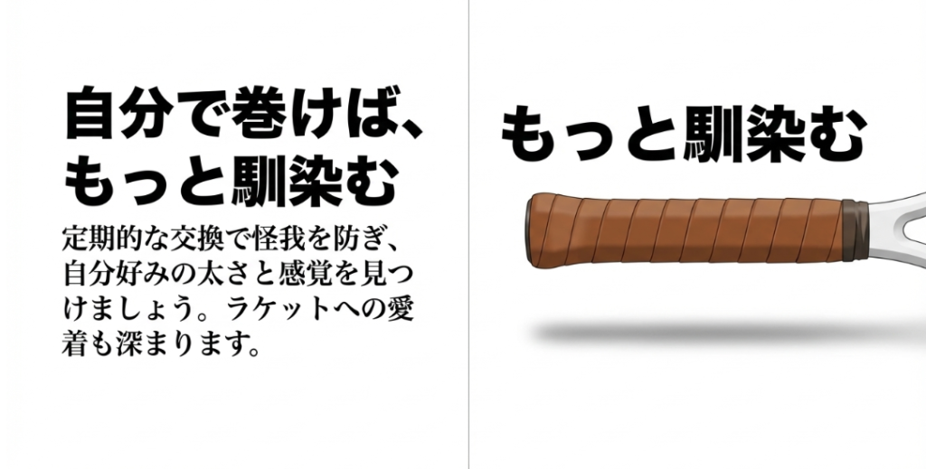 一方で左利きの方は、これと全く逆の「左下がり」に巻く必要があります。左利きの方が右利き用の巻き方のままプレイすると、摩擦の方向が逆になり、テープがめくれ上がりやすくなってしまいます。ご自身の利き手に合わせてカスタマイズできるのも、自分で交換する最大のメリットですね。