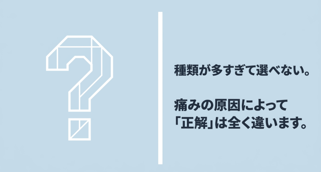 実は、ジュニア層が抱えやすいオスグッドや成長痛から、高齢者の変形性膝関節症、さらには半月板のトラブルまで、痛みの原因によって選ぶべきアイテムは全く異なります。また、しっかり固定したい医療用と、動きやすさを重視したスポーツ用の違いも知っておく必要があります。