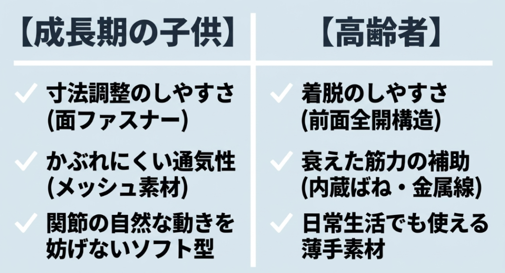 注意点として、大人のように関節全体をガチガチに固める金属ステー入りのサポーターは、成長期の自然な関節の動きを妨げてしまう可能性があります。症状にもよりますが、基本的には適度な圧迫で動きやすさを損なわないソフトサポートタイプから試してみるのがおすすめです。