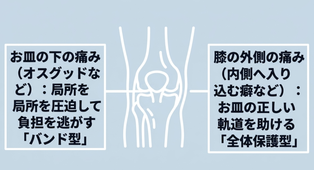 この「お皿の下の痛み」に対しては、膝全体を覆うスリーブ型のサポーターではなく、膝のお皿のすぐ下をピンポイントで圧迫するバンド型やストラップ型のサポーターが適しています。バンドで適切に圧力をかけることで、ジャンプやダッシュの際に骨へと伝わる牽引力を物理的に逃がす効果が期待できます。