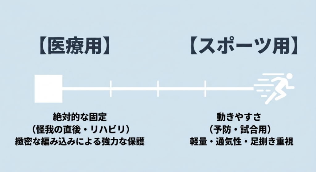 サポーターを探していると、「医療用(メディカルライン)」と「スポーツ用」という言葉を目にすることがあると思います。この2つは、根本的な設計思想が異なります。