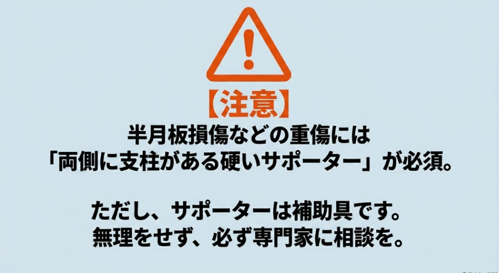 ただし、半月板損傷などの深刻な怪我の場合、サポーターはあくまで補助的なものです。痛みを我慢してプレーを続けると症状が悪化する恐れがあるため、最終的な判断は専門家にご相談ください。適切な診断とリハビリを経た上での復帰ツールとして活用しましょう。