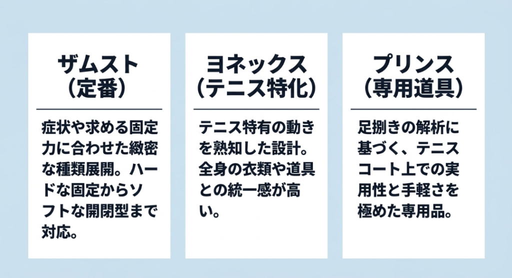選び方のポイントが分かったところで、実際にテニスプレーヤーから支持を集めている代表的なブランドとその特徴を見ていきましょう。それぞれのブランドが持つ設計思想や強みを知ることで、より自分にフィットするアイテムを見つけやすくなるかなと思います。