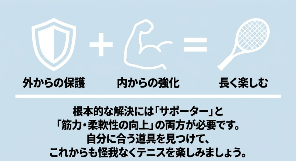 ここまで、テニスの膝サポーターについておすすめの選び方やブランドの特徴を解説してきましたが、いかがでしたでしょうか。サポーターは、痛みへの不安を和らげ、プレー中の関節を物理的に守ってくれる非常に心強いアイテムです。