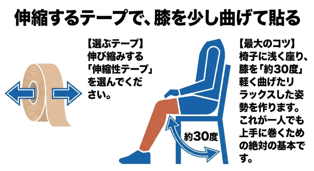 セルフテーピングを成功させるための最大のコツであり絶対的な前提となるのが、「巻く時の関節の角度」の正確な設定です。靭帯が最も効率的に張力を発揮できる長さを確保し、関節の安定した肢位を保つため、膝関節を約30度屈曲させた状態(軽く曲げた状態)を基本姿勢とします。椅子に浅く座って、少し膝を曲げたリラックスした姿勢を作ると、一人でもテープが非常に巻きやすくなりますよ。