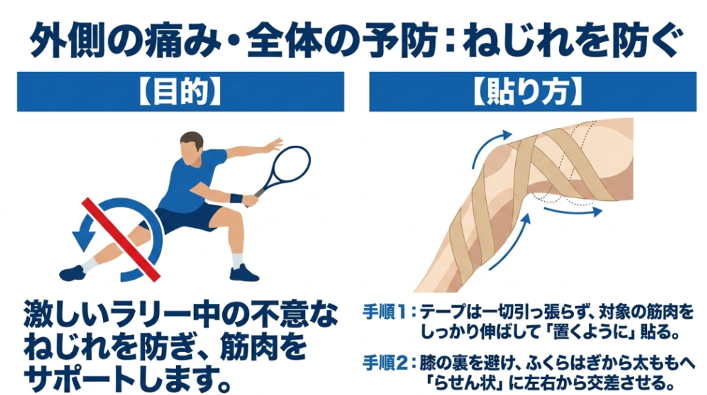 特定の明確な痛みはないものの、激しいラリー中における膝の不意な捻じれを予防し、関節全体の安定感と自己受容感覚(プロプリオセプション)を高めたい場合には、筋・筋膜の螺旋状の繋がりを考慮したスパイラル状の全体サポートテーピングが推奨されます。この方法は、関節の自由度を維持しつつ、危険な可動域の限界手前で自然とブレーキをかけるような安心感を提供してくれます。