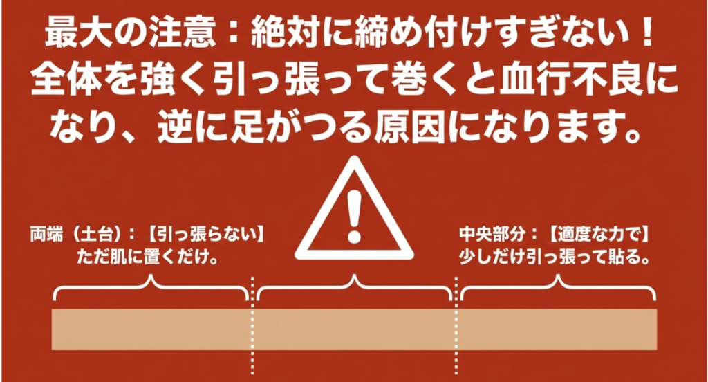 セルフテーピングを行う上で、アマチュアプレイヤーが最も陥りやすい罠であり、最大の注意を払うべき点が「圧迫力のコントロール」です。膝への不安からサポート感を高めようとするあまり、テープ全体をギュウギュウに引っ張って強く巻きすぎてしまう方が非常に多いんですね。大腿部や下腿部を強く締め付けてしまうと、下肢の血流やリンパの流れが著しく阻害されてしまいます。