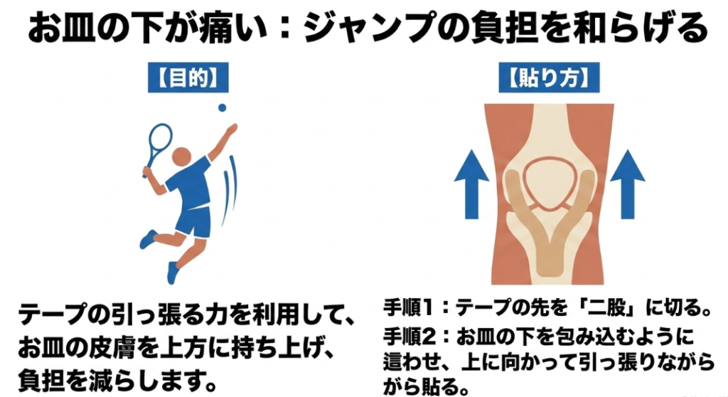 サーブ時のジャンプや急激なストップ動作によって膝のお皿の下(膝蓋腱部)に局所的な痛みが生じるジャンパー膝に対しては、関節をガチガチに固定するアプローチは逆効果になることがあります。このような痛みには、膝蓋骨(お皿)を物理的・皮下組織的に押し上げ、腱への牽引ストレスを和らげる除圧(デコンプレッション)テーピングが極めて有効です。