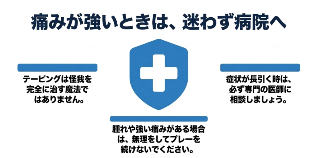 今回ご紹介した膝のテーピングの巻き方や健康・怪我に関する情報は、あくまで一般的な目安としての情報提供です。テーピングは怪我を完全に治癒させる魔法のツールではありません。強い痛みがある場合や、腫れ、熱感が生じている場合は絶対に無理をしてプレーを続けないでください。症状が長引く場合や強い不安がある際の最終的な判断は、必ず整形外科などの医療機関を受診し、専門家にご相談ください。また、テープの粘着剤による皮膚のかぶれ等に関する正確な情報は、各メーカーの公式サイトをご確認くださいね。