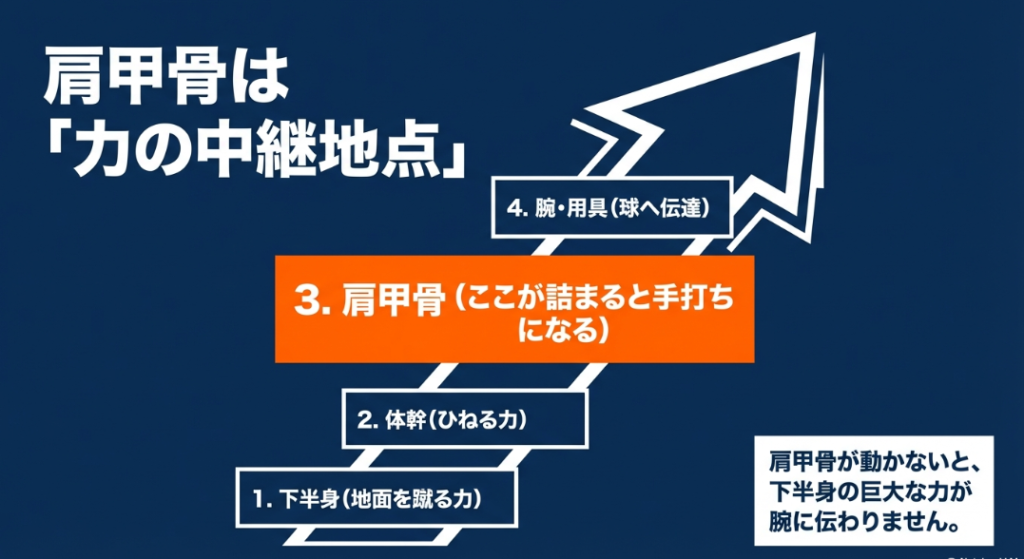 テニスのスイングは、腕の力だけでラケットを振っているように見えて、実は足元から生み出された莫大なパワーを全身に伝達していく「運動連鎖(キネティックチェーン)」という精巧な仕組みで成り立っています。この運動連鎖において、下半身から湧き上がるエネルギーと腕の動きを繋ぐ、極めて重要な中継地点となるのが肩甲骨なんですね。