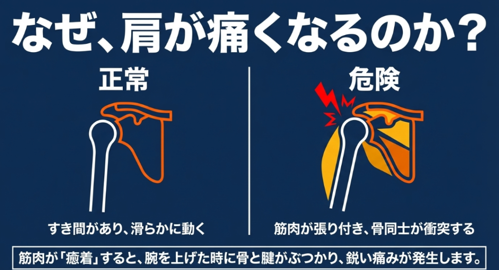 このインピンジメント症候群というのは、腕を上に挙げたり内側にねじったりした際に、肩甲骨の先端部分である「肩峰」と、腕の骨(上腕骨)の頭部分が物理的にぶつかってしまう状態を指します。骨同士が衝突することで、その狭い隙間を通っている腱板(ローテーターカフと呼ばれる深層のインナーマッスル)や、クッションの役割を果たす滑液包が挟み込まれて摩擦を起こし、チクチクとした鋭い痛みや強い炎症を引き起こしてしまうんですね。