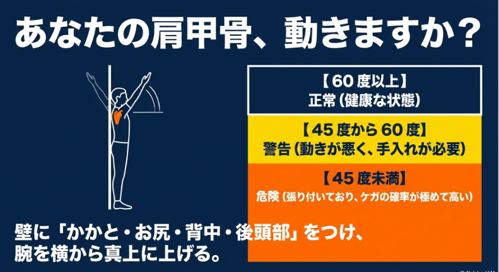 45度〜60度肩甲骨の動きが少し悪くなっており、周囲の筋肉の緊張が始まっています。放っておくとパフォーマンスが落ちるため、積極的なケアが必要です。