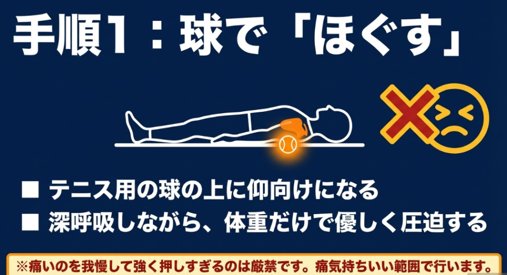 前半では肩甲骨のメカニズムや痛みの原因について詳しくお話ししてきましたが、ここからは実際に体を動かして改善していくための実践的なアプローチをご紹介していきますね。硬くなった筋肉をほぐすボールケアから始まり、可動域を広げるポールストレッチ、そして正しい姿勢を維持するための筋力トレーニングまで、順番に進めていくことがテニス上達の近道になります。特別な器具がなくても自宅で始められるものばかりですので、ぜひ今日からでも試してみてください。