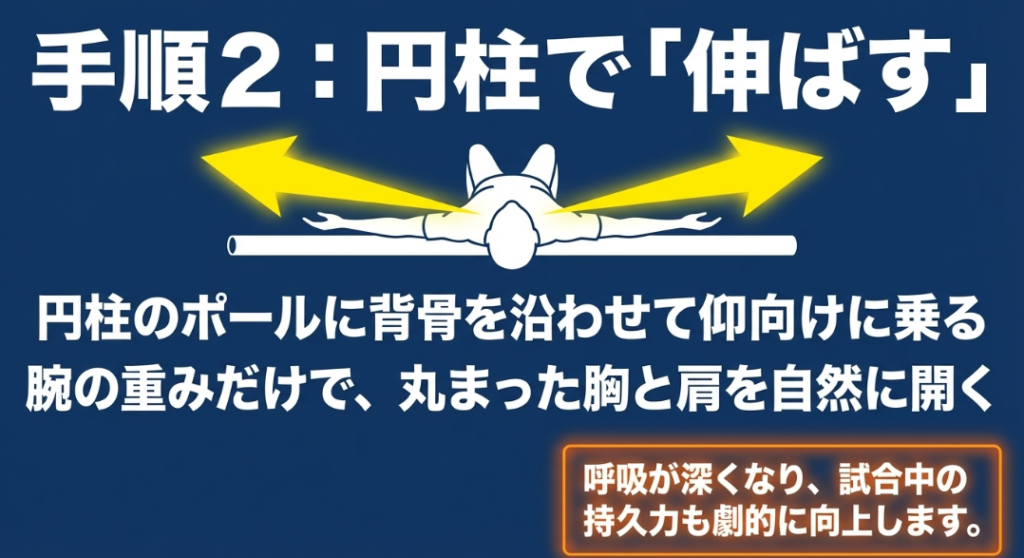 ポールの上で行うケアメソッドは多岐にわたりますが、まず基本となるのが「床磨き運動」です。ポールに仰向けに乗り、ひじから下を床につけたまま、手のひらで床に円を描くようにこする微細な動きを行います。これによって肩関節の深層にあるインナーマッスルが優しく刺激され、肩甲骨が正しい位置へと整っていきます。また、ポールの上で鳥が羽ばたくような上下の軌道で腕を動かす「鳥の羽ばたき運動」も非常に効果的です。肩甲骨の上方回旋と下方回旋という、テニスのサーブ動作に直結するダイナミックな連動性がスムーズになり、スイングの可動域が劇的に広がっていくのを実感できるかなと思います。