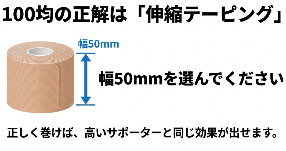 自分で巻く手間はかかりますが、100均のテーピングを使えば、数千円の専用サポーターに匹敵する「痛みの緩和効果」を、たった110円で作り出すことができるのです。