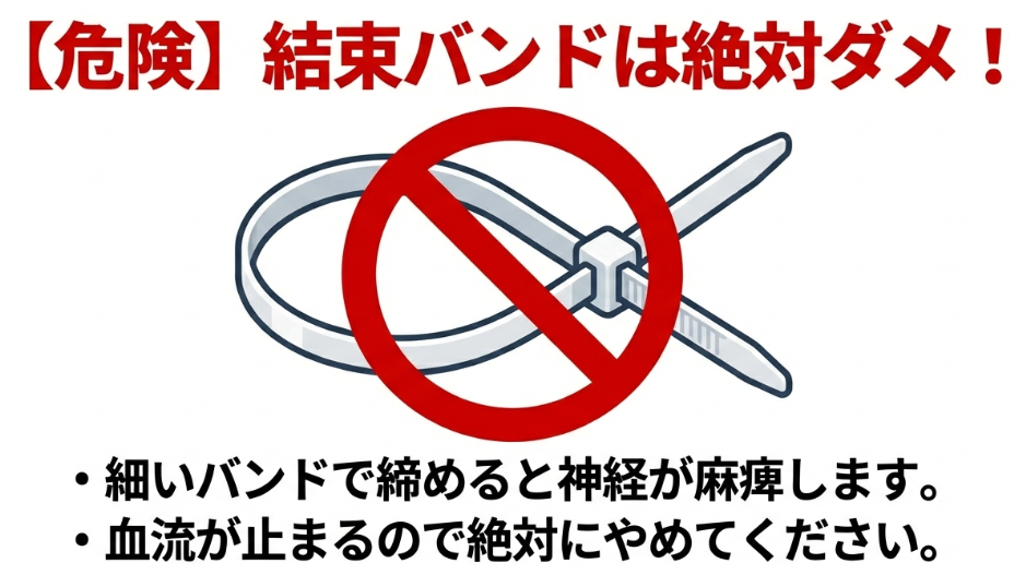 プラスチック製の結束バンドや、細い紐、輪ゴムなどで腕を強く締め付けると、動脈や静脈を圧迫して深刻な血流障害を引き起こす可能性があります。
