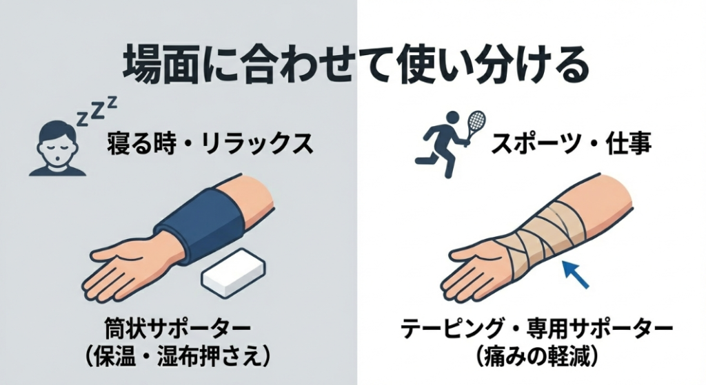 まとめると、ダイソーやセリアで売られている筒状のサポーターは、単体ではテニス肘の痛みを劇的に改善する力は持っていません。しかし、保温や保護といったケアの基礎部分では十分に役立ちます。