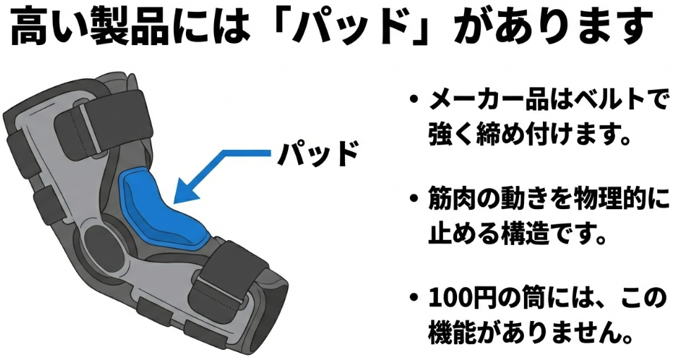 100均の筒状サポーターは、腕全体を均一に圧迫するだけで、痛みの原因となっている筋肉をピンポイントで押さえ込む「パッド」や、締め付けを調整する「ベルト」が付いていません。