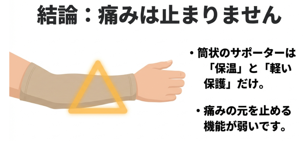 結論から申し上げますと、「保温や軽い保護には役立つが、テニス肘の痛みを根本的に止める機能は極めて弱い」というのが偽らざる本音です。
