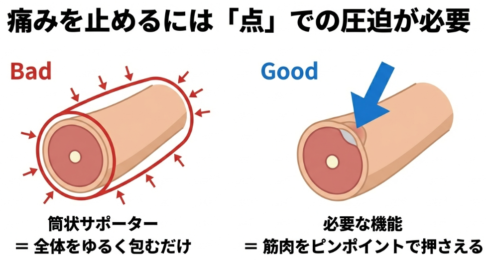 そのため、装着しても筋肉の動きに伴う腱への引っ張り力を遮断できず、「着けているのに痛い」という状況になりがちなのです。