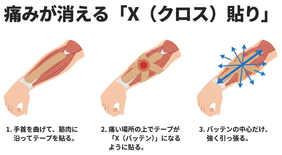 この「クロス圧迫貼り」により、痛みの発生源に局所的な圧力がかかり、手首や指を動かした時の痛みが驚くほど楽になるはずです。