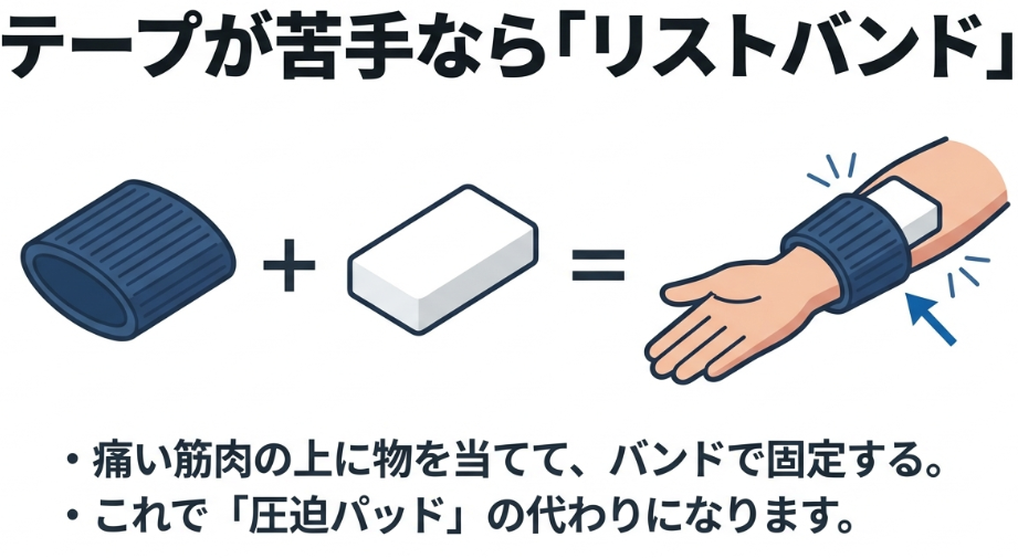 そこで、100均で売っている「化粧用スポンジ」や「消しゴム」、あるいは「丸めたガーゼ」などを、痛みのある筋肉の上(痛い場所から指2〜3本分手首側)に当て、その上からリストバンドを被せて固定してみてください。